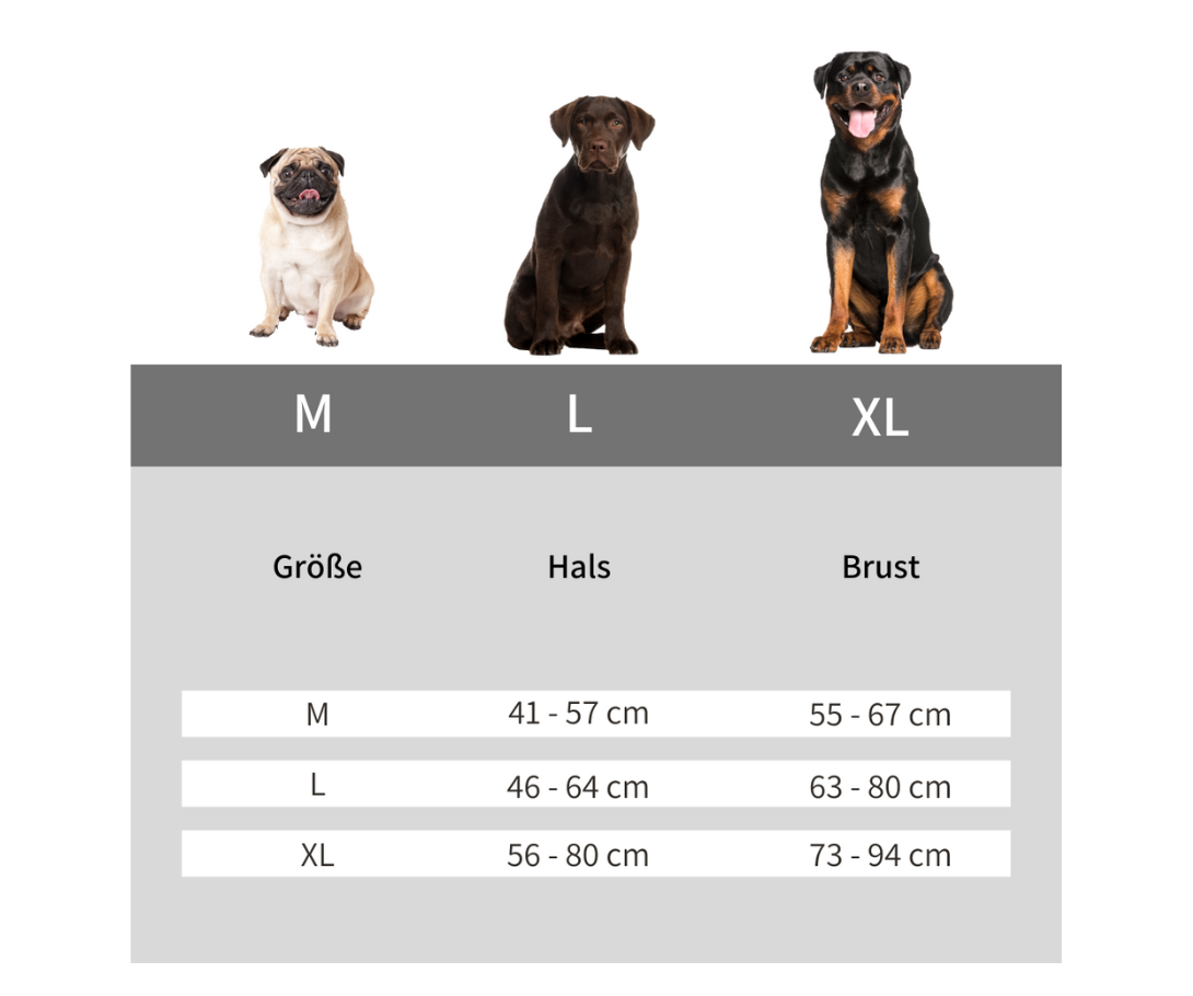 Die Größentabelle bietet eine Übersicht der passenden Maße für das PawElite Hundegeschirr. Wähle Größe M für kleinere Hunde wie den Mops, L für mittelgroße Hunde wie den Labrador und XL für größere Hunde wie den Rottweiler. Die Angaben zu Hals- und Brustumfang ermöglichen eine präzise Auswahl.