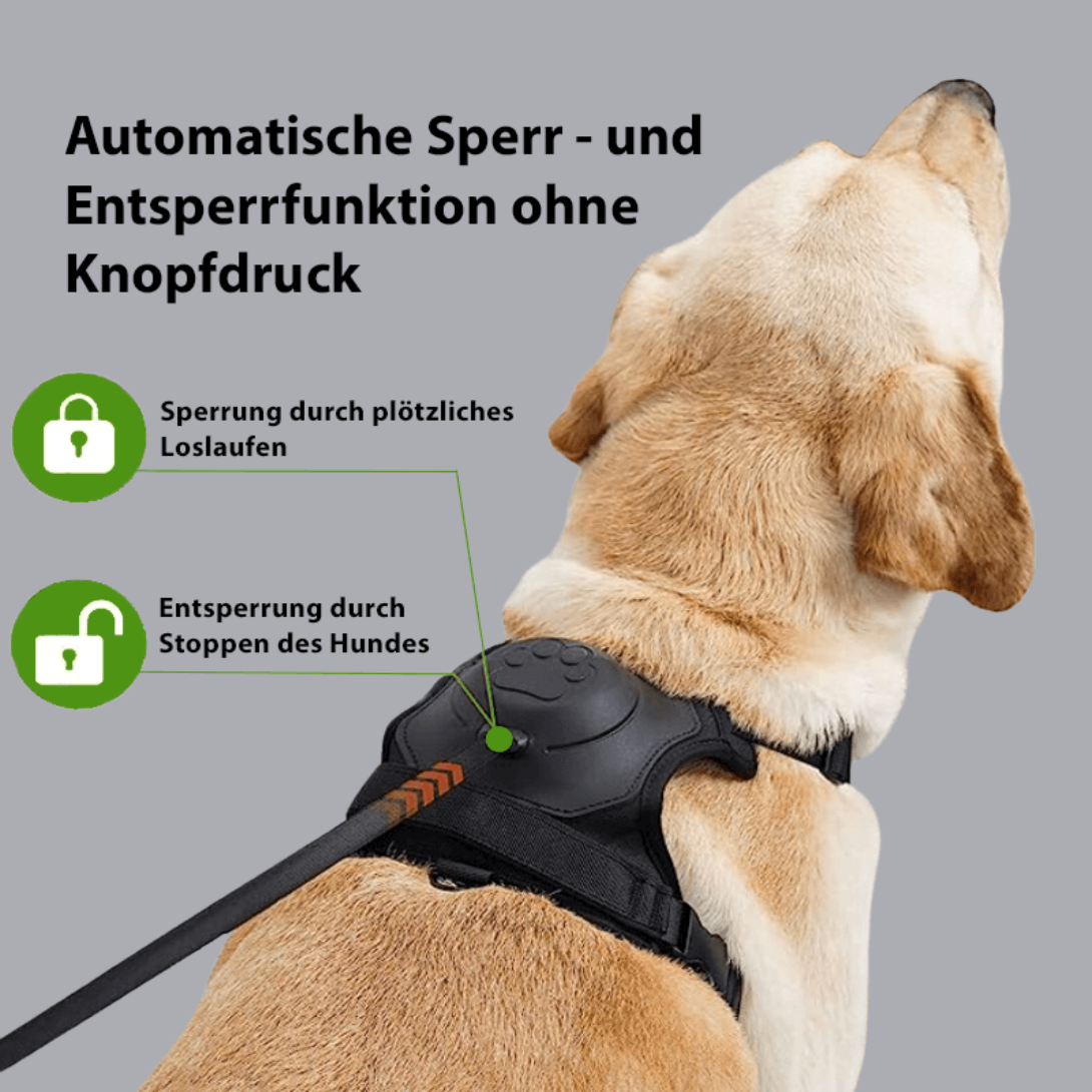 Das PawElite Hundegeschirr ist mit einer intelligenten automatischen Sperr-Funktion ausgestattet. Sie stoppt die ausziehbare Leine sofort, wenn Dein Hund plötzlich ruckartig zieht, und sorgt so für maximale Kontrolle und Sicherheit bei jedem Spaziergang.
